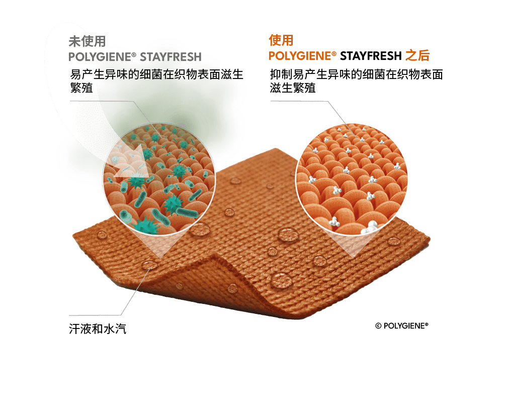 Polygiene® StayFresh 可抑制引起异味的细菌生长,从源头上控制气味。